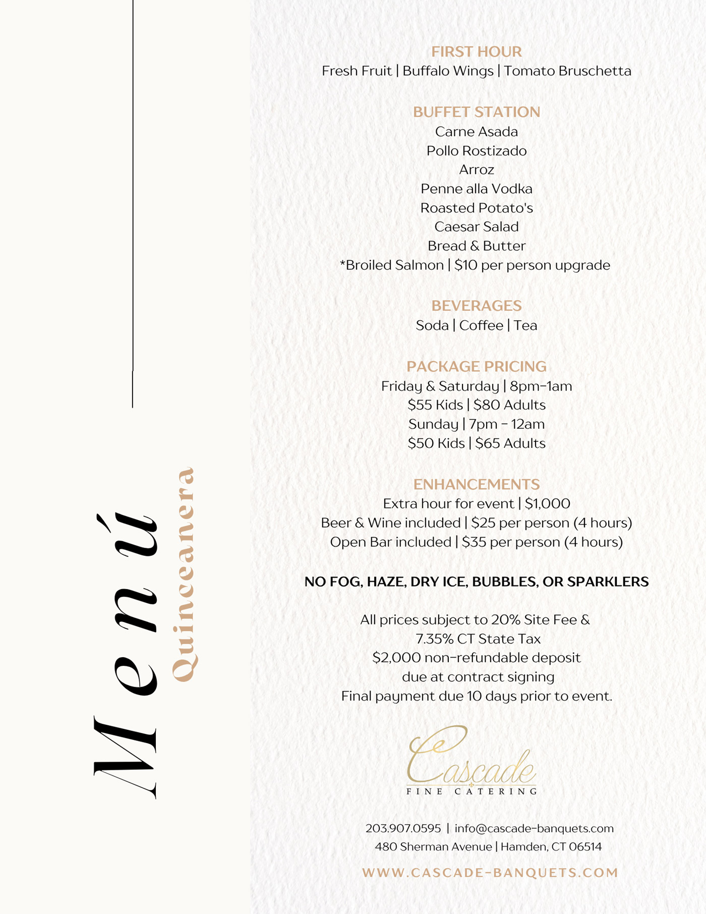 At Cascade Fine Catering, we understand that a Quinceañera is a cherished milestone. Our dedicated team collaborates with you to craft a personalized menu and ensure every detail reflects her unique style. From the initial consultation to the final dance, we handle each aspect with professionalism and care, allowing you to relax and enjoy this unforgettable celebration.